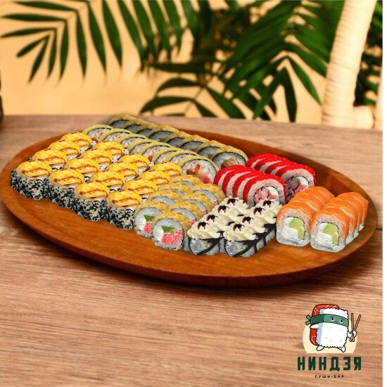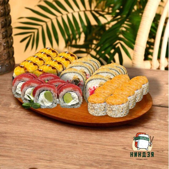 🍣 Цунами: Рис, нори, сыр творожный, огурец, сырный соус, кунжут, соус терияки, мидии - 330 гр.