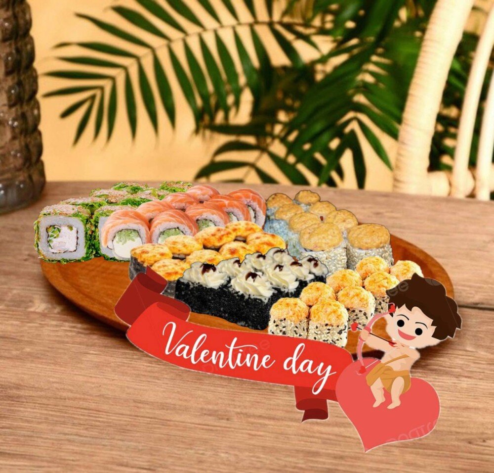 🍣Цунами: Рис, нори, сыр творожный, огурец, сырный соус, кунжут, соус терияки, мидии-330 гр.