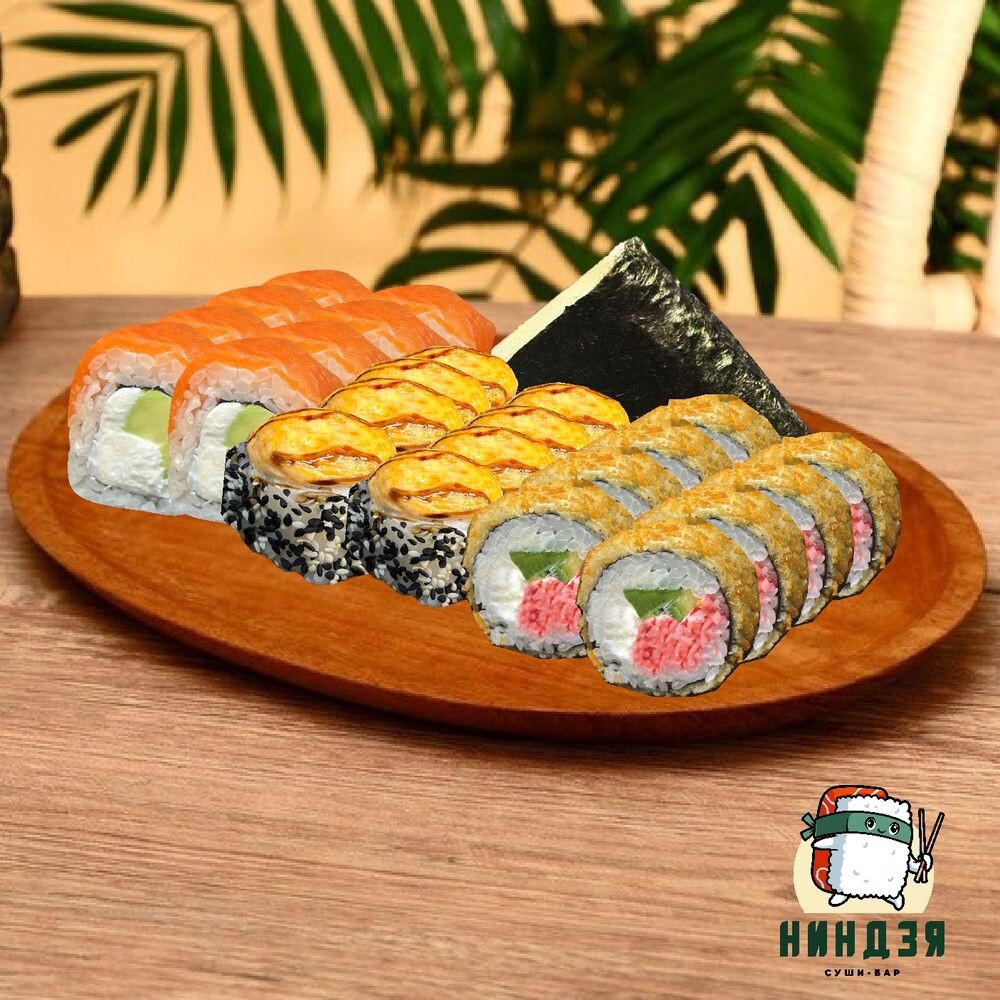 🍣 Мантра 8 шт. : Рис, нори, огурец, кальмар, сыр творожный, кунжут, сливочно-чесночный соус, соус терияки- 330 гр.