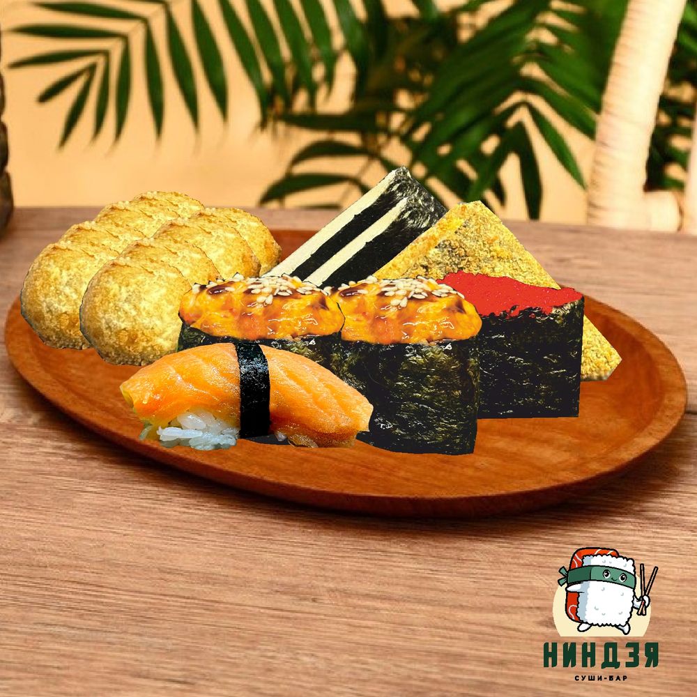 🍣 Рисовые шарики темпура с лососем 8 шт.: нори, рис, сыр творожный, сыр гауда, соус терияки, лосось, кляр, темпура - 220 гр.