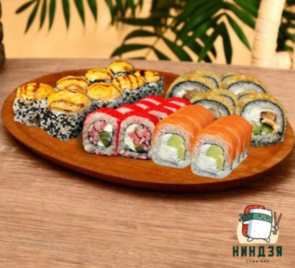 - ролл "Ниндзя": рис, нори, сыр творожный, краб, сливочно-чесночный соус, соус терияки, кунжут чёрно-белый, лук фри - 8 шт.