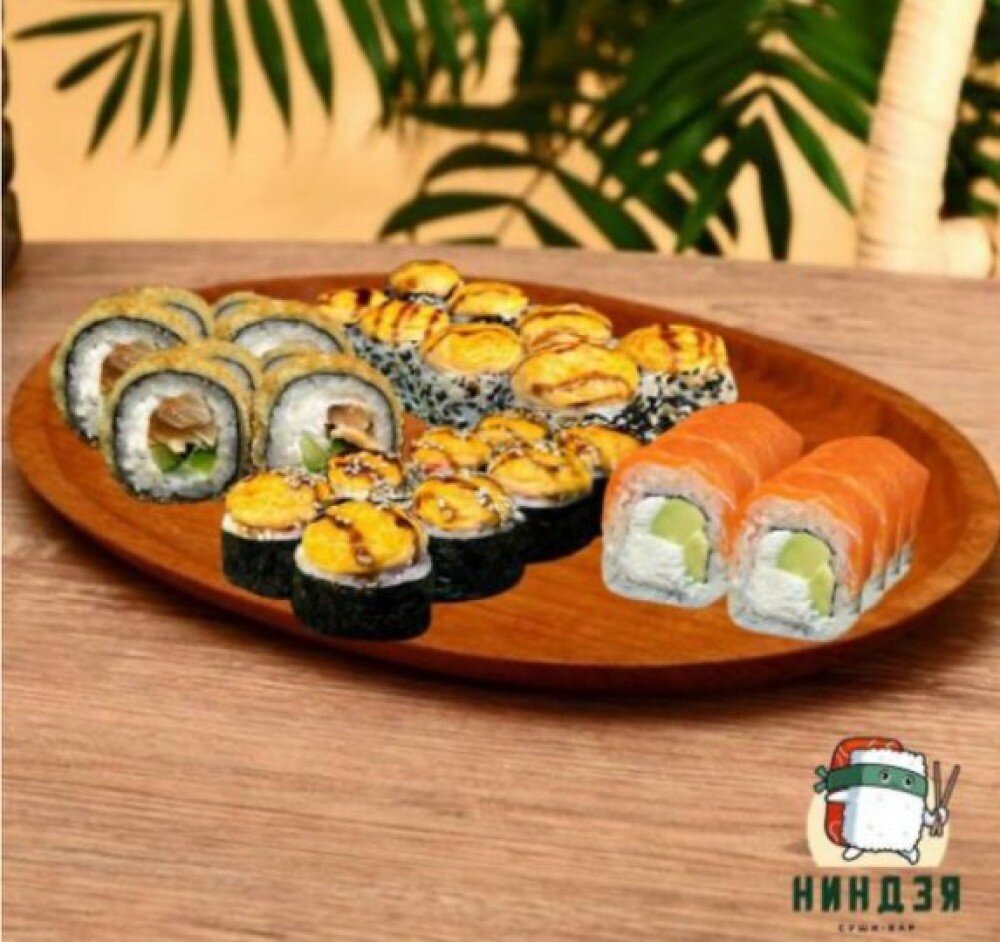 - ролл "Ниндзя": рис, нори, сыр творожный, краб, сливочно-чесночный соус, соус терияки, кунжут чёрно-белый, лук фри - 8 шт.