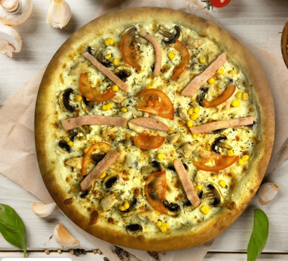 Тесто, соус сметанный, сыр моцарелла, ананас, ветчина, курица, грибы, помидор, кукуруза, сухой чеснок.