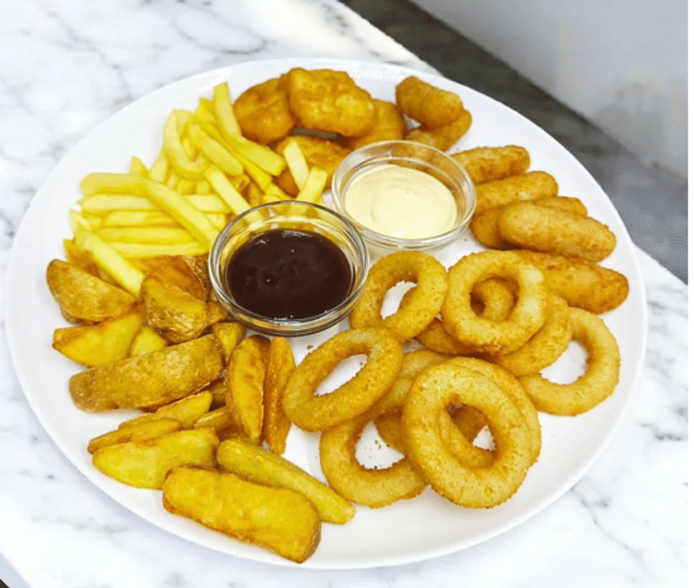 Картофель фри, картофельные дольки, сырные палочки, луковые кольца,наггетсы, соус барбекю, соус сырный