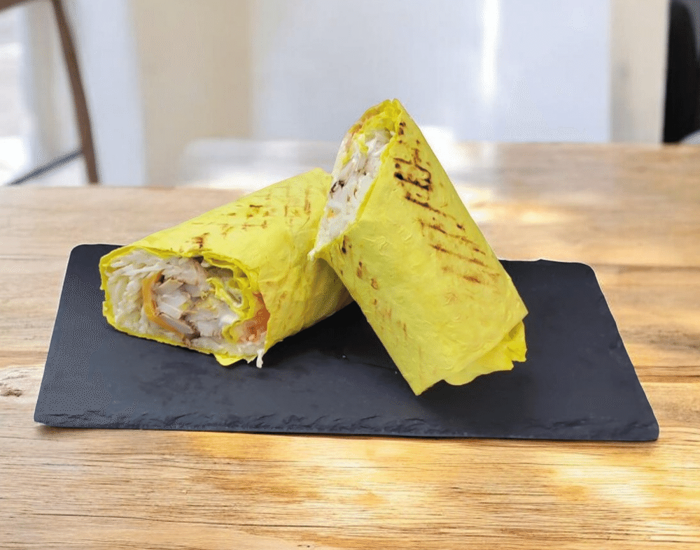 Чесночный соус,курица,капуста, свежий огурец,томат, сыр чеддер, соус сырный