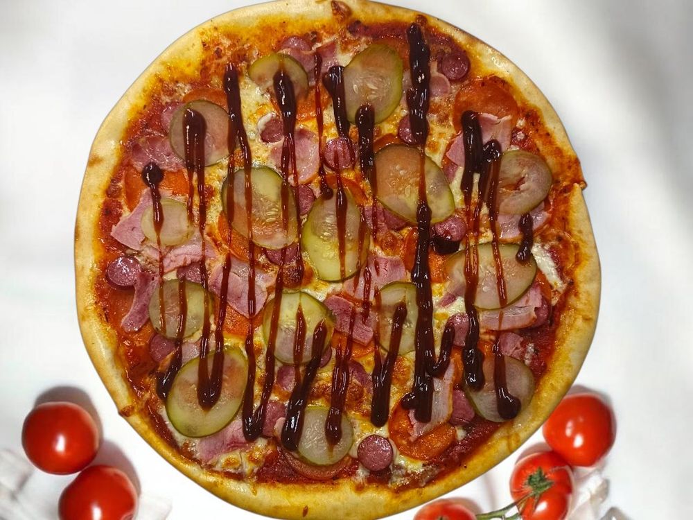Тесто, соус красный, сыр, колбаски, бекон,пепперони, огурцы, соус барбекю.