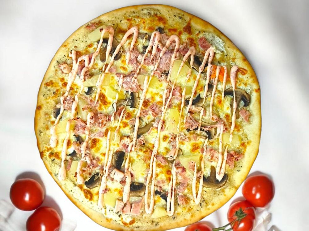 Тесто, белый соус, сыр, грибы, ананас, курица, спайси соус.