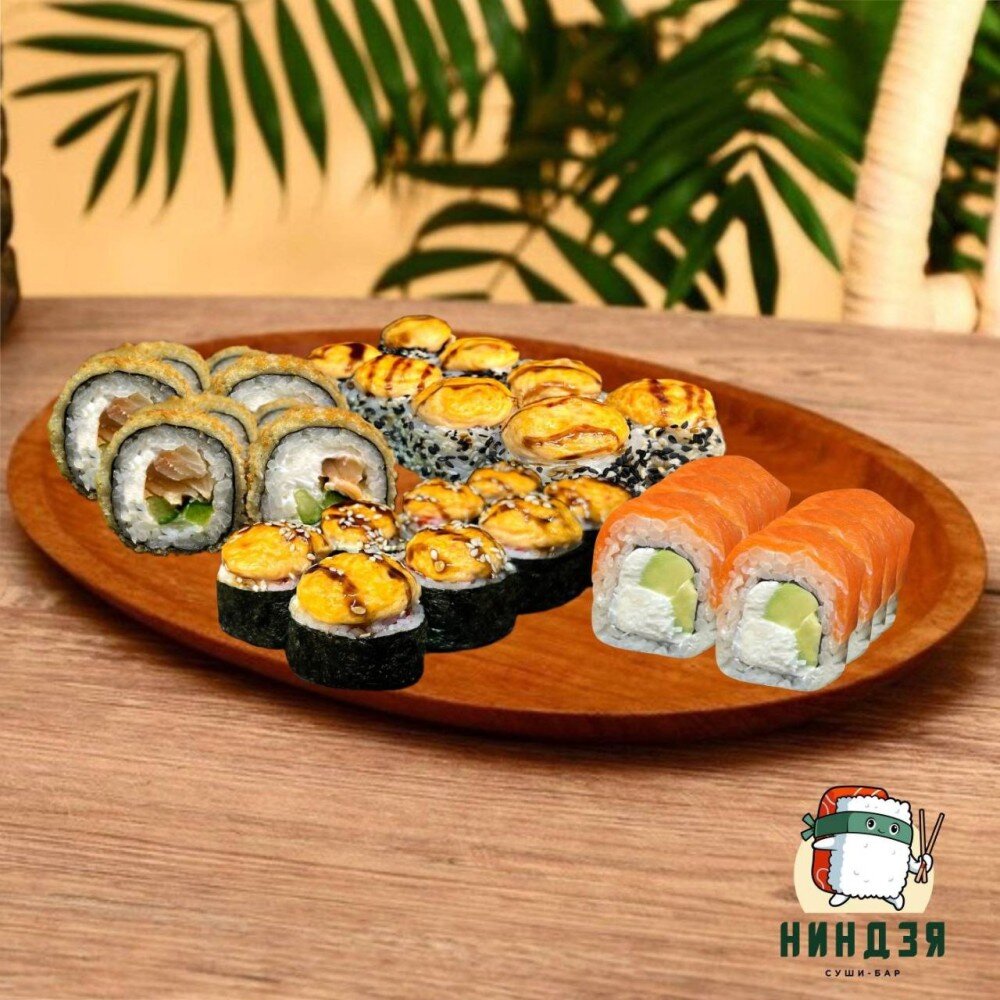 - "Ниндзя": рис, нори, сыр творожный, краб, сливочно-чесночный соус, соус терияки, кунжут чёрно-белый, лук фри - 8 шт.