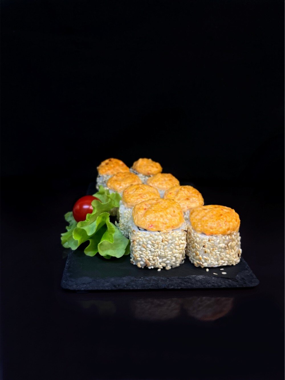 Рис, нори, сыр творожный, авокадо, креветка, сырная шапочка, терияке, кунжут