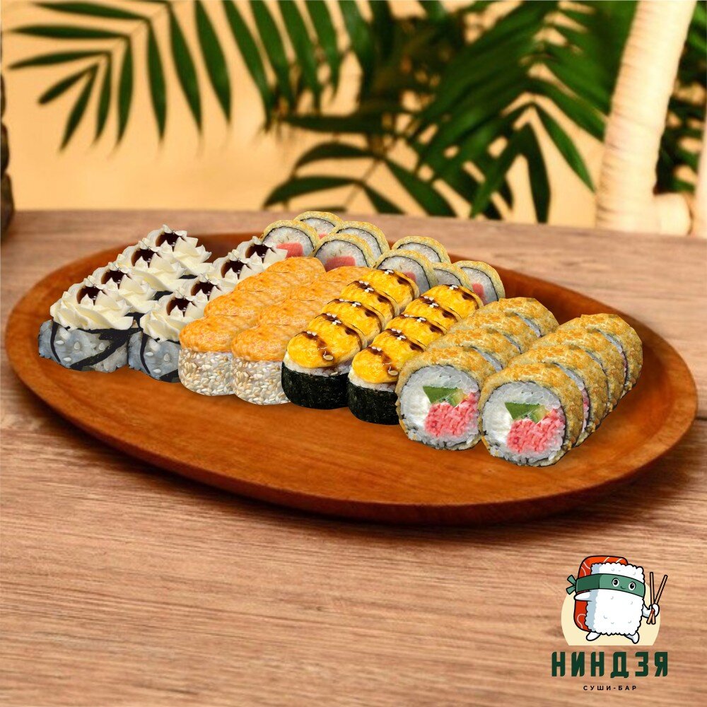 🍣 Цунами: Рис, нори, сыр творожный, огурец, сырный соус, кунжут, соус терияки, мидии - 330 гр.