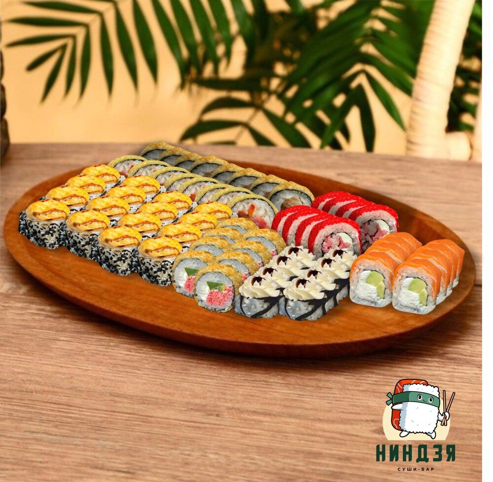 🍣 Ниндзя: Рис, нори, сыр творожный, краб, сливочно-чесночный соус, соус терияке, кунжут чёрно-белый, лук фри-305 гр.