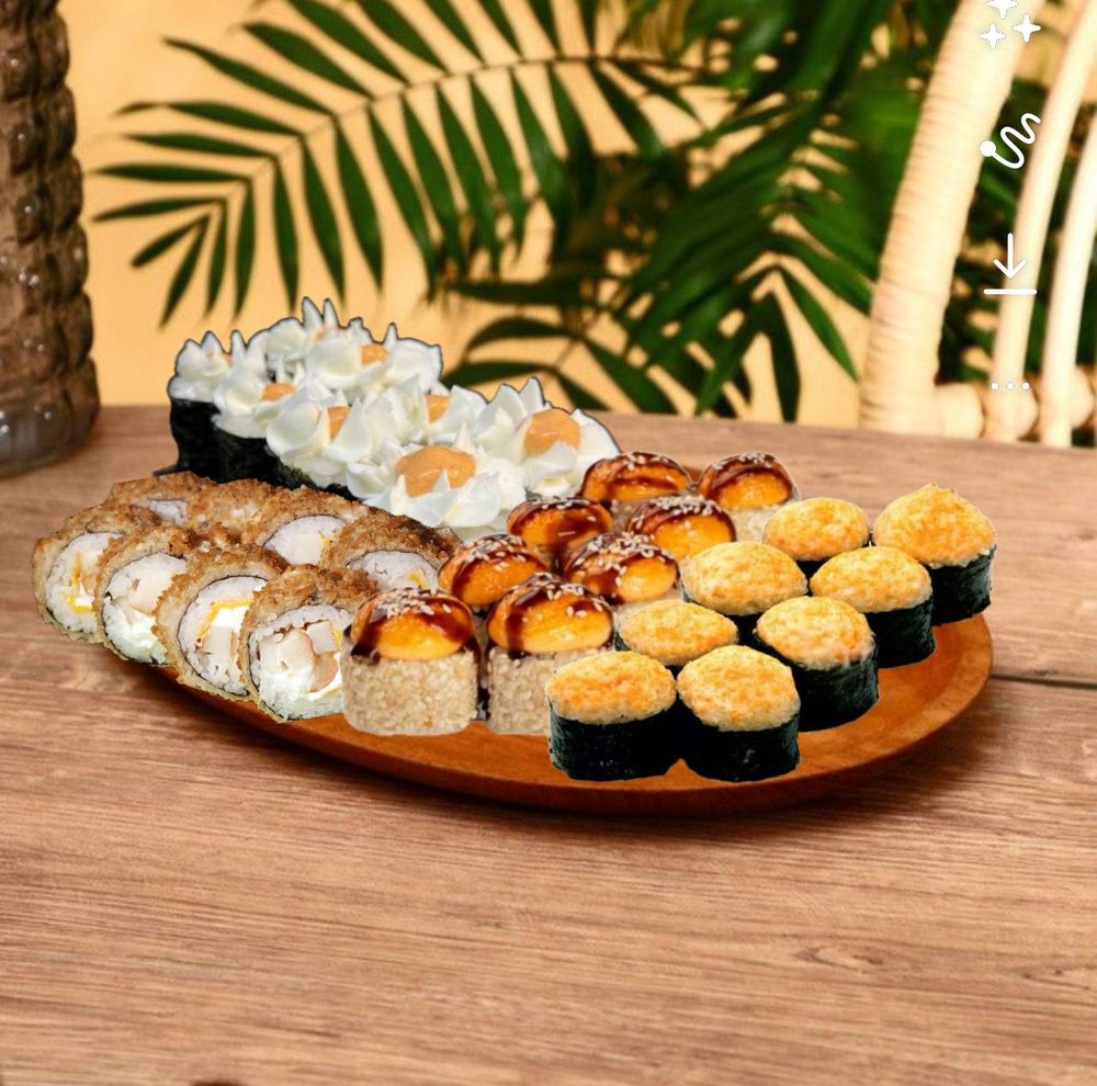 🍣Фараон:Рис, нори, сыр творожный, курица копчёная, краб, сливочно-чесночная шапочка, кунжут, терияке,